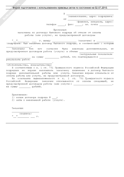 - 40Претензия заказчика по договору бытового подряда об отказе от оплаты работы или услуги, не предусмотренной договором