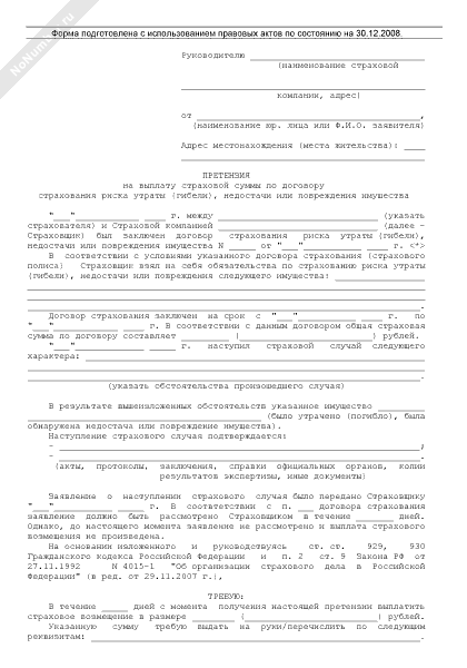 - 54Претензия к страховой компании на выплату страховой суммы по договору страхования риска утраты (гибели), недостачи или повреждения имущества