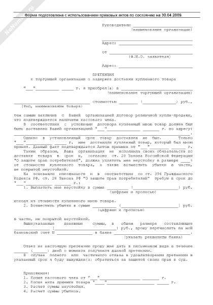 - 57Претензия к торгующей организации о задержке доставки купленного товара