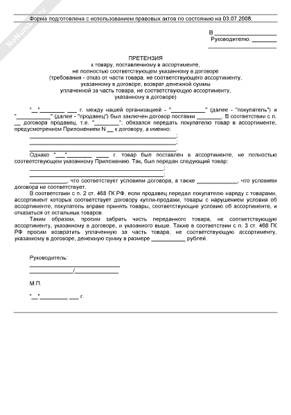 - 55Претензия к товару, поставленному в ассортименте, не полностью соответствующем указанному в договоре (требования — отказ от части товара, не соответствующего ассортименту, указанному в договоре, возврат денежной суммы уплаченной за часть товара, не соответствующую ассортименту, указанному в договоре)