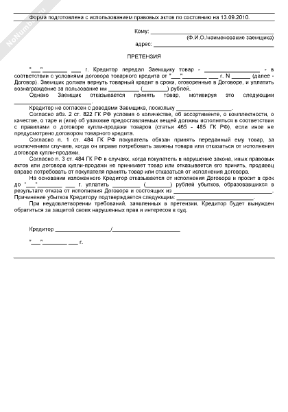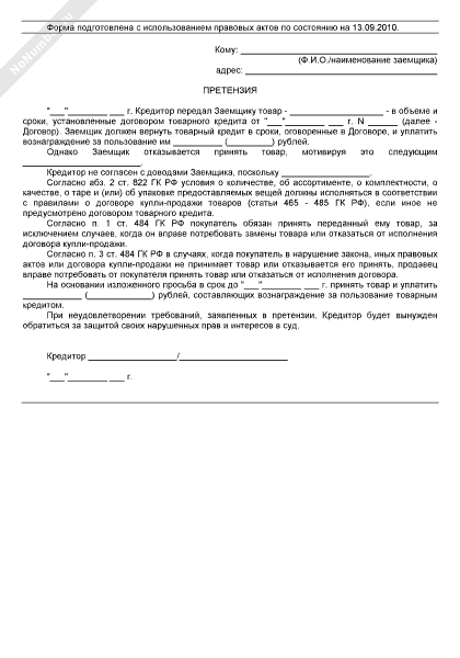 - 58Претензия кредитора к заемщику принять переданный по договору товарного кредита товар