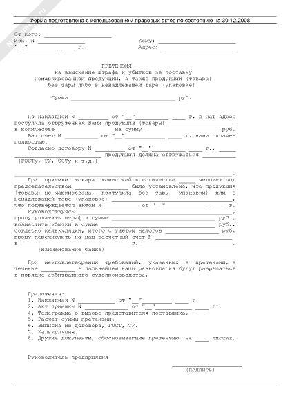 - 60Претензия на взыскание штрафа и убытков за поставку немаркированной продукции, а также продукции (товара) без тары либо в ненадлежащей таре (упаковке)