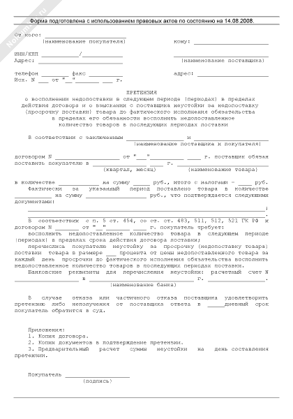 - 116Претензия о восполнении недопоставки в следующем периоде (периодах) в пределах действия договора и о взыскании с поставщика неустойки за недопоставку (просрочку поставки) товара до фактического исполнения обязательства в пределах его обязанности восполнить недопоставленное количество товаров в последующих периодах поставки