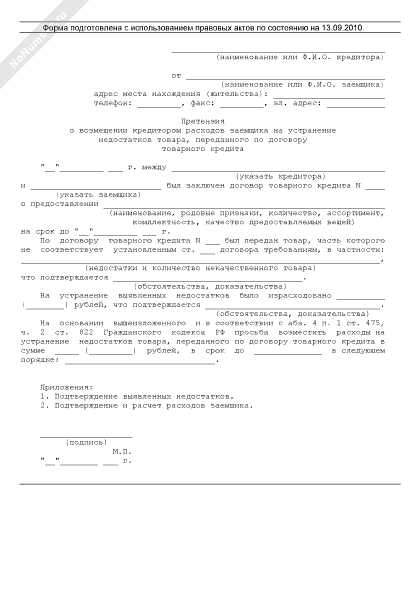 - 114Претензия о возмещении кредитором расходов заемщика на устранение недостатков товара, переданного по договору товарного кредита
