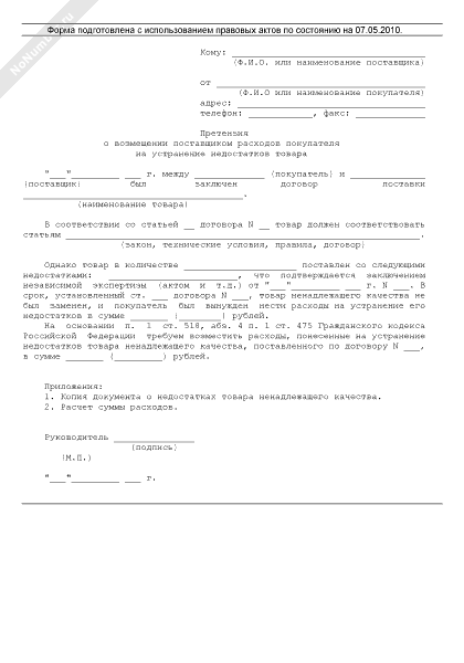 - 112Претензия о возмещении поставщиком расходов покупателя на устранение недостатков товара