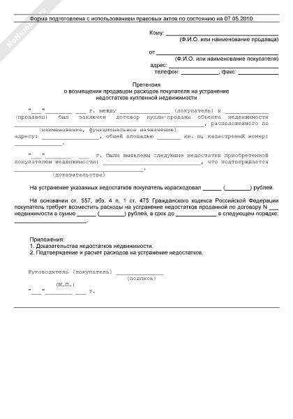 - 113Претензия о возмещении продавцом расходов покупателя на устранение недостатков купленной недвижимости