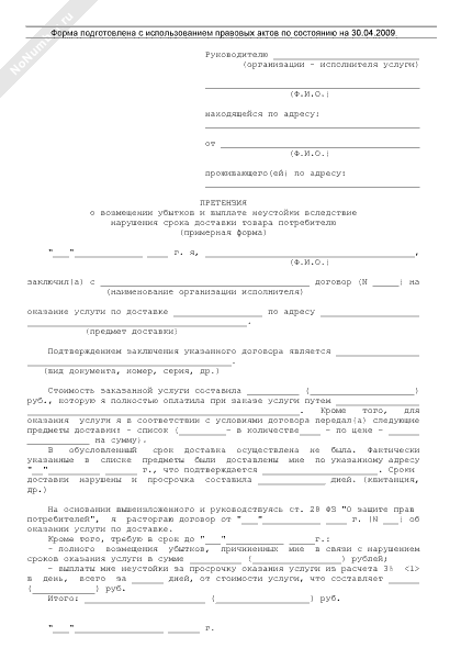 - 104Претензия о возмещении убытков и выплате неустойки вследствие нарушения срока доставки товара потребителю