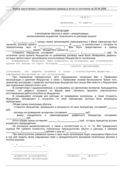 - 105Претензия о возмещении убытков в связи с ненадлежащим использованием имущества, полученного по договору проката