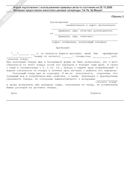 - 108Претензия о возврате денежной суммы, уплаченной за непродовольственный товар надлежащего качества, приобретенный по каталогу