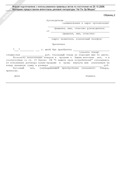 - 107Претензия о возврате денежной суммы, уплаченной за непродовольственный товар надлежащего качества, в связи с отсутствием в продаже аналогичного товара другого цвета