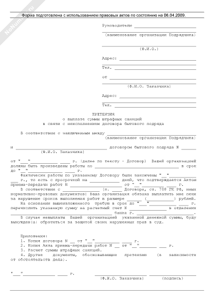 - 117Претензия о выплате суммы штрафных санкций в связи с неисполнением договора бытового подряда