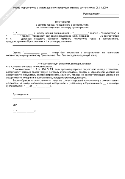 - 118Претензия о замене товара, переданного в ассортименте, не соответствующем договору купли-продажи