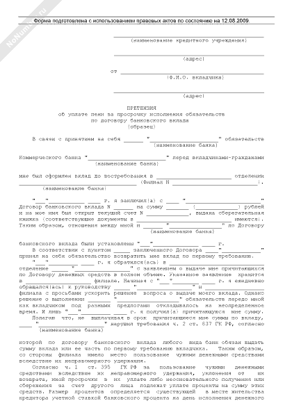 - 143Претензия об уплате пени за просрочку исполнения обязательств по договору банковского вклада