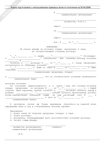 - 144Претензия об уплате штрафа за поставку товара (продукции) в таре, не соответствующей условиям договора
