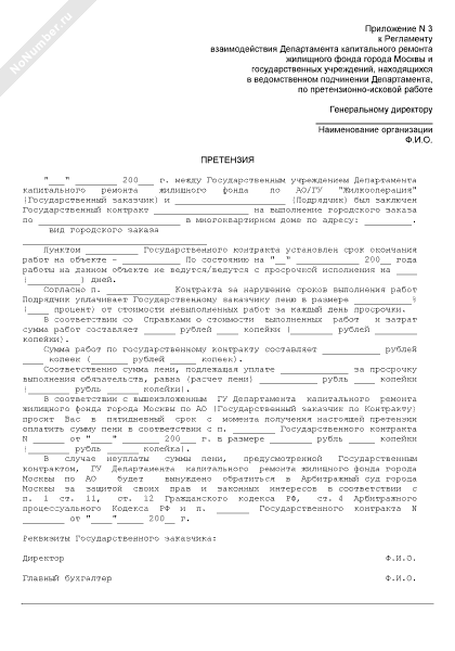 - 142Претензия об уплате штрафных санкций за нарушение сроков выполнения работ по государственному контракту на выполнение городского заказа