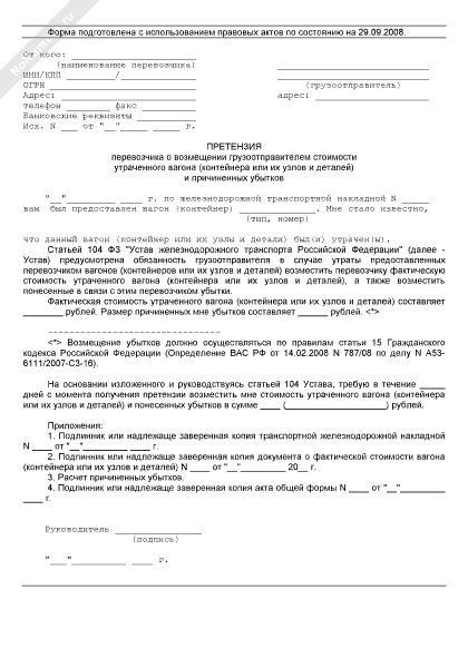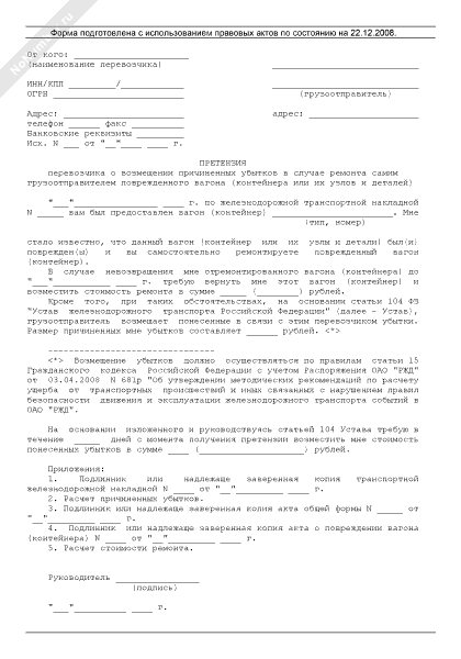 - 148Претензия перевозчика о возмещении грузоотправителем стоимости ремонта поврежденного вагона (контейнера или их узлов и деталей) и причиненных убытков