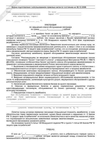 - 152Претензия по нарушению класса обслуживания пассажира при авиаперевозке