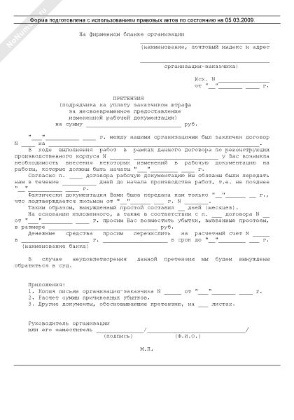 - 156Претензия подрядчика на уплату заказчиком штрафа за несвоевременное предоставление измененной рабочей документации