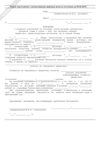 - 157Претензия покупателя о возврате продавцом уплаченной по договору купли-продажи предприятия денежной суммы в связи с тем, что продавец передал имущество, предусмотренное договором, не в полном объеме
