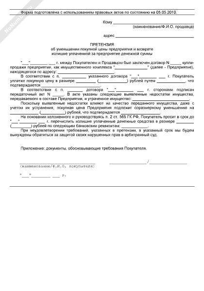 - 160Претензия покупателя об уменьшении продавцом покупной цены предприятия на основании зафиксированных в передаточном акте сведений о выявленных недостатках предприятия и об утраченном имуществе и возврате излишне уплаченной за предприятие денежной суммы