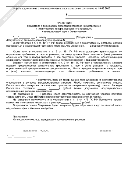 - 164Претензия покупателя о возмещении продавцом расходов на затаривание и (или) упаковку товара, переданного продавцом в ненадлежащей таре и (или) упаковке