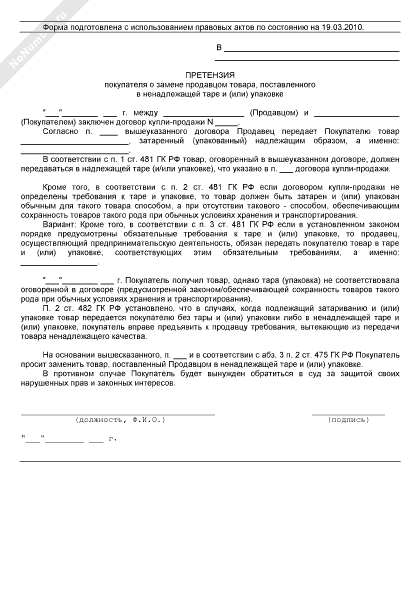 - 166Претензия покупателя о замене продавцом товара, поставленного в ненадлежащей таре и (или) упаковке