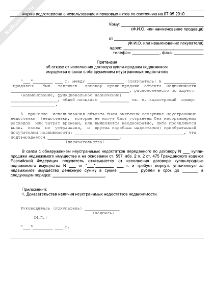 - 167Претензия покупателя об отказе от исполнения договора купли-продажи недвижимого имущества в связи с обнаружением неустранимых недостатков (недостатков, которые не могут быть устранены без несоразмерных расходов или затрат времени, или выявляются неоднократно, либо проявляются вновь после их устранения, и других подобных недостатков) с требованием возврата продавцом уплаченной за недвижимое имущество денежной суммы