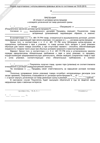 - 165Претензия покупателя в связи с передачей продавцом товара в ненадлежащей таре и (или) упаковке (требование — отказ от договора и возврат уплаченной за товар денежной суммы)