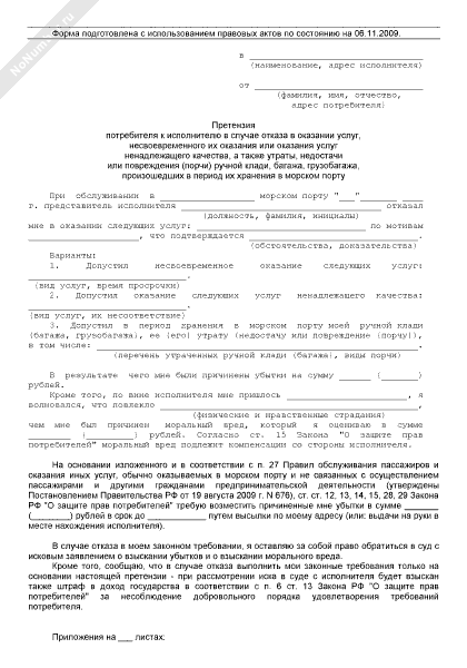 - 171Претензия потребителя к исполнителю в случае отказа в оказании услуг, несвоевременного их оказания или оказания услуг ненадлежащего качества, а также утраты, недостачи или повреждения (порчи) ручной клади, багажа, грузобагажа, произошедших в период их хранения в морском порту