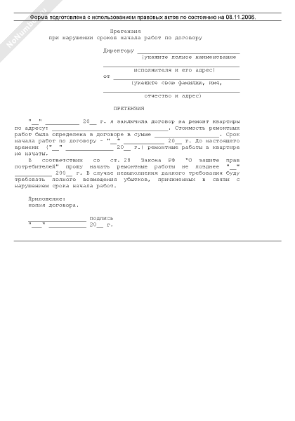 - 173Претензия при нарушении сроков начала работ по договору на ремонт квартиры