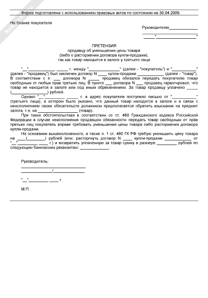 - 175Претензия продавцу об уменьшении цены товара (либо о расторжении договора купли-продажи), так как товар находится в залоге у третьего лица