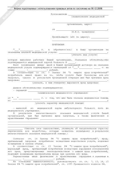 Претензия на некачественное оказание медицинской услуги