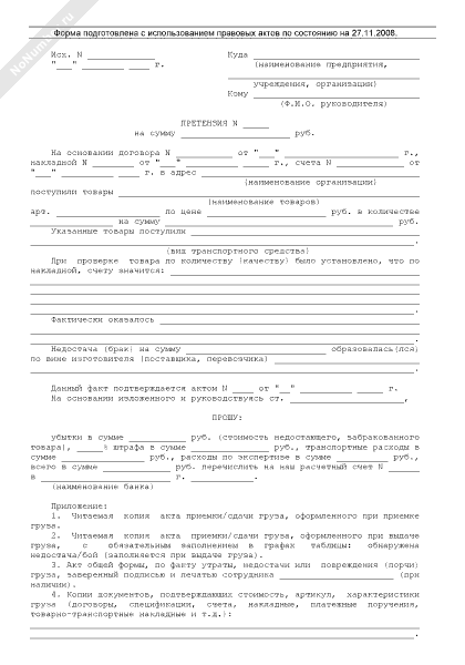 Претензия о возмещении убытков, причиненных недостачей (браком) товара