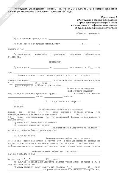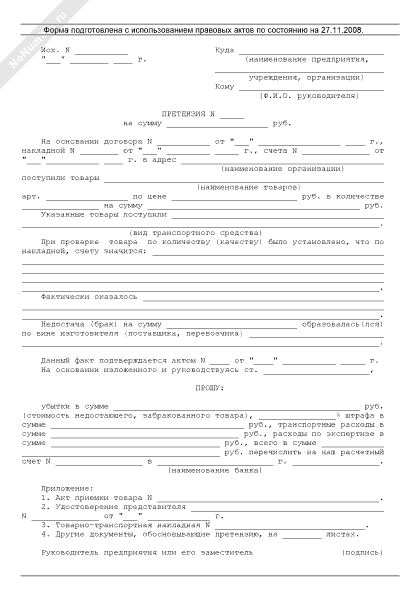 Претензия поставщику на дефект изделия