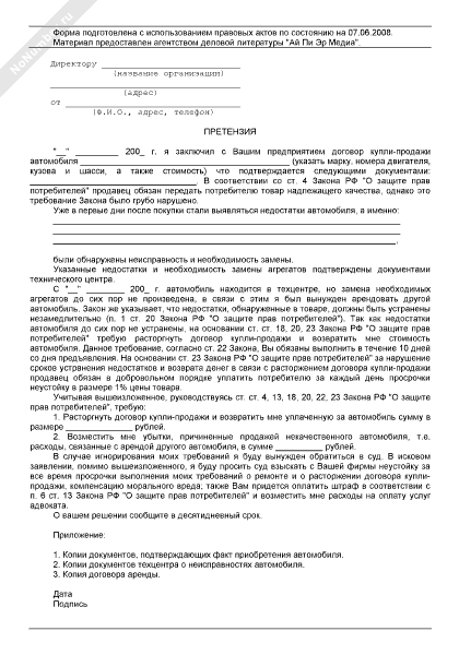 Претензия на некачественное выполнение работ по ремонту автомобиля (рекомендуемый образец заполнения)