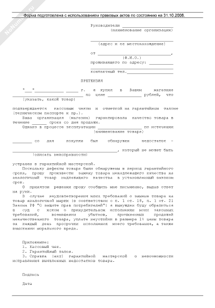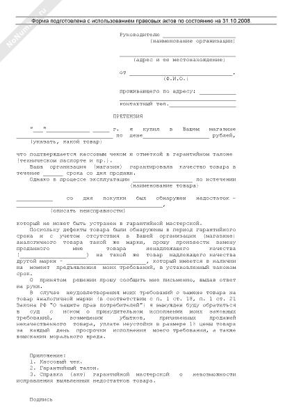Претензия о замене некачественного товара на товар другой марки (рекомендуемый образец заполнения)