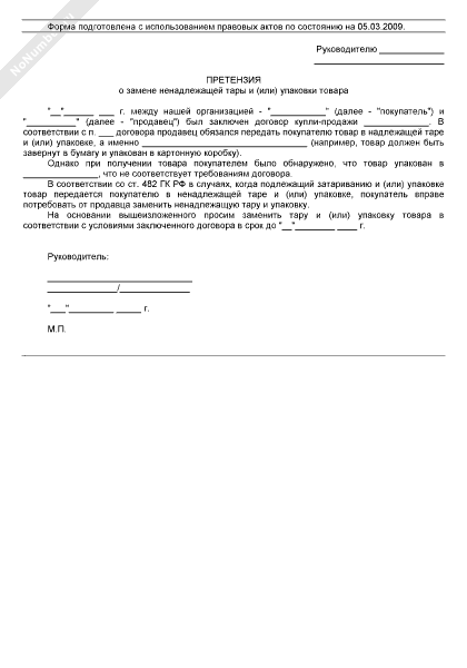 Претензия о замене ненадлежащей тары и (или) упаковки товара