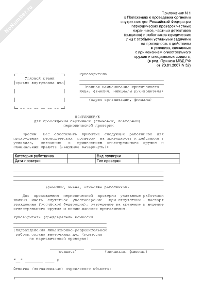 - 2Приглашение для прохождения первичной (плановой, повторной) периодической проверки частных охранников, частных детективов (сыщиков) и работников юридических лиц с особыми уставными задачами на пригодность к действиям в условиях, связанных с применением огнестрельного оружия и специальных средств органами внутренних дел Российской Федерации