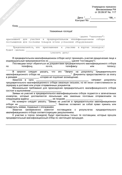- 3Приглашение к участию в предварительном квалификационном отборе подрядчиков для выполнения работ по последующему предмету торгов (конкурса)