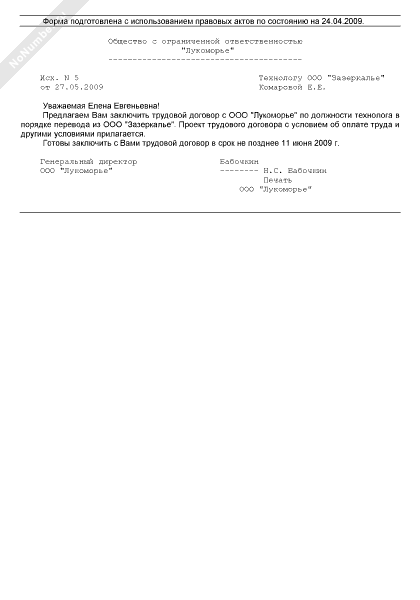 - 20Приглашение от будущего работодателя работнику с предложением о трудоустройстве в порядке перевода