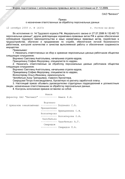 - 275Приказ о назначении ответственных за обработку персональных данных
