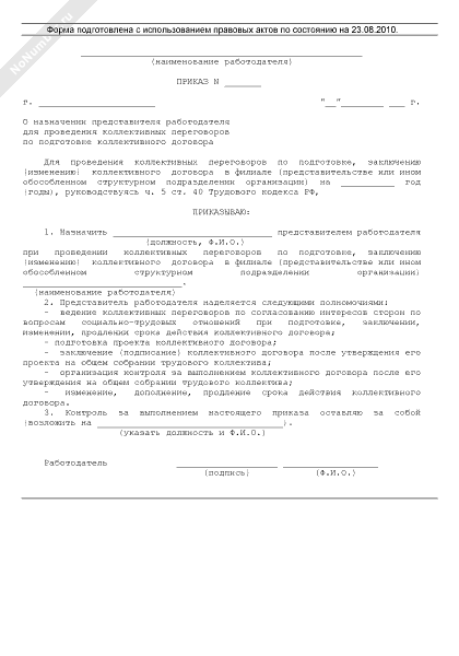 - 266Приказ о назначении представителя работодателя для проведения коллективных переговоров по подготовке, заключению или изменению коллективного договора