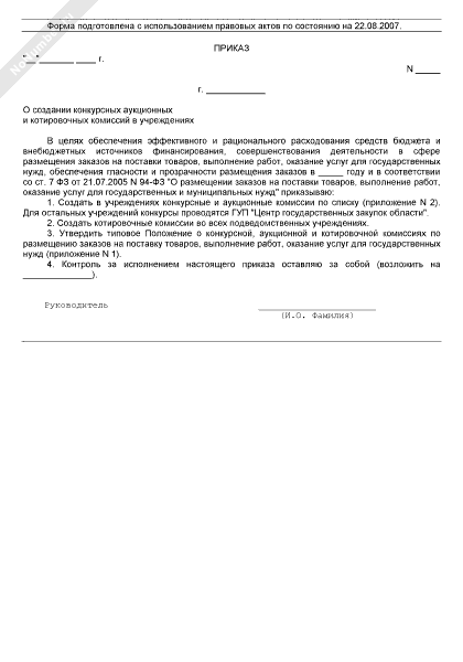 - 594Приказ о создании конкурсных аукционных и котировочных комиссий по размещению заказов на поставку товаров, выполнение работ, оказание услуг для государственных (муниципальных) нужд в учреждениях