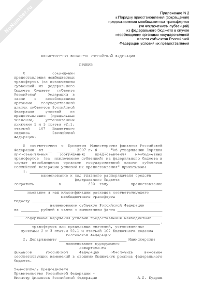 - 626Приказ о сокращении предоставления межбюджетных трансфертов (за исключением субвенций) из федерального бюджета бюджету субъекта Российской Федерации в связи с несоблюдением органами государственной власти субъектов Российской Федерации условий их предоставления (предельных значений, установленных пунктами 2 и 3 статьи 92.1, статьей 107 Бюджетного кодекса Российской Федерации)