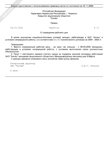 - 627Приказ о сокращении рабочего дня в целях улучшения социально-бытовых условий женщин