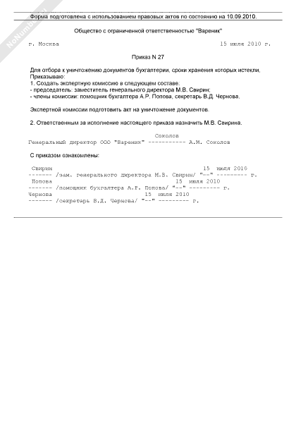 - 622Приказ о создании экспертной комиссии для отбора к уничтожению документов бухгалтерии, сроки хранения которых истекли
