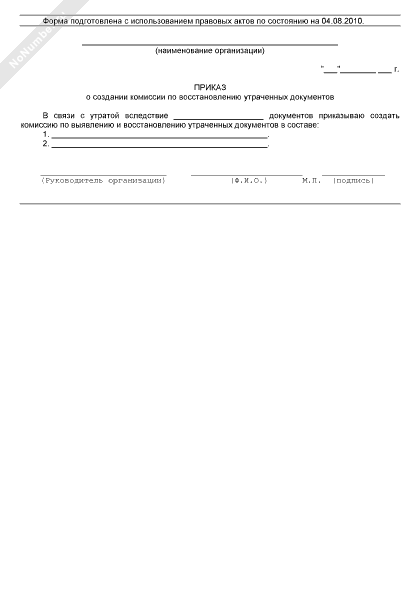 - 621Приказ о создании комиссии по восстановлению утраченных документов организации