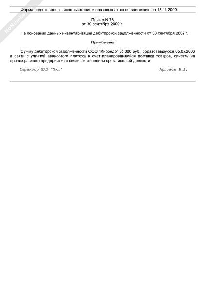 - 633Приказ о списании дебиторской задолженности в связи с истечением срока исковой давности