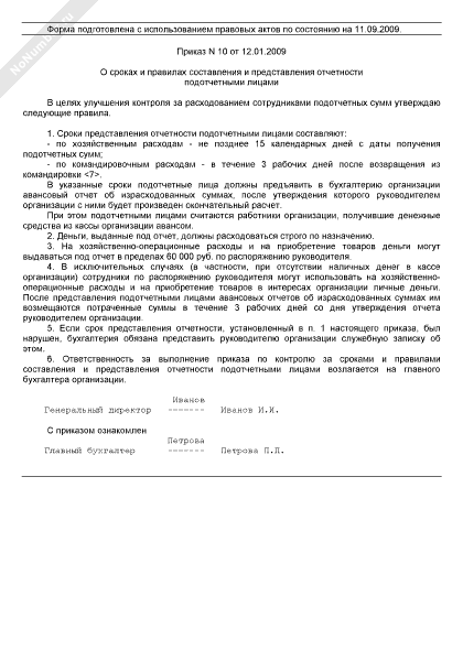 - 636Приказ о сроках и правилах составления и представления отчетности подотчетными лицами (в целях улучшения контроля за расходованием сотрудниками подотчетных сумм)