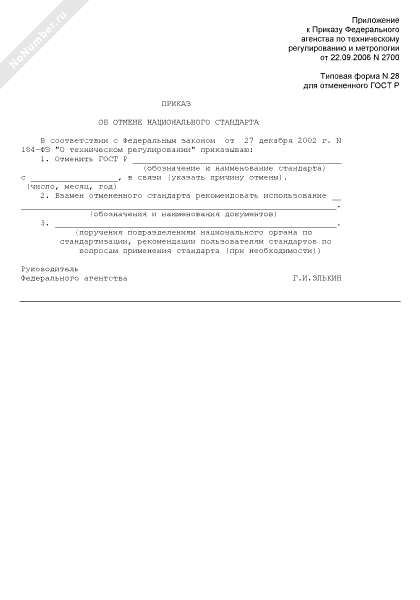 - 723Приказ об отмене национального стандарта (для отмененного ГОСТ Р) (типовая форма № 28)